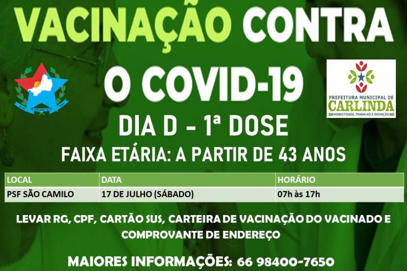 A Prefeitura Municipal de Carlinda informa sobre a administração da 1º dose da Vacina contra a Covid-19 aos munícipes com faixa etária a partir dos 43 anos, que será realizada nesse sábado (17/07), no PSF São Camilo, no horário das 7:00 às 17:00 horas.