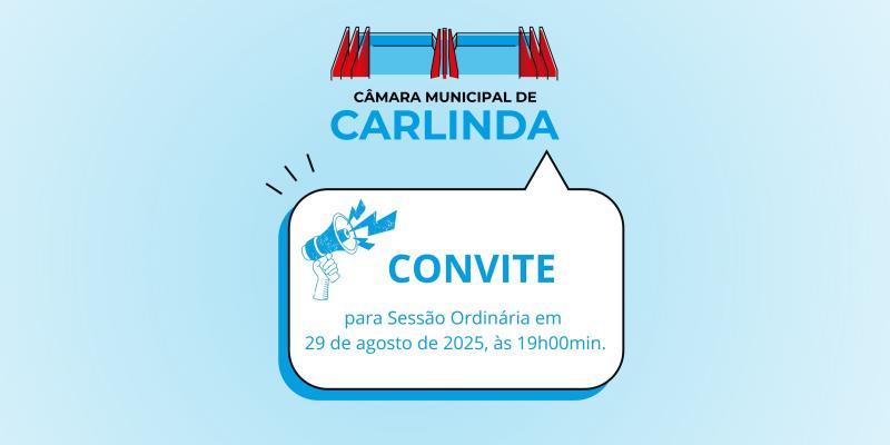 Lucia de Souza Kanno, Presidente da Câmara Municipal de Vereadores de Carlinda, Estado de Mato Grosso, no uso de suas atribuições legais, convida toda a população a participar da próxima Sessão Ordinária a ser realizada no dia 29 de agosto de 2025, com início às 19h00min, na sede da Câmara Municipal de Carlinda.