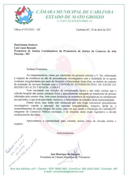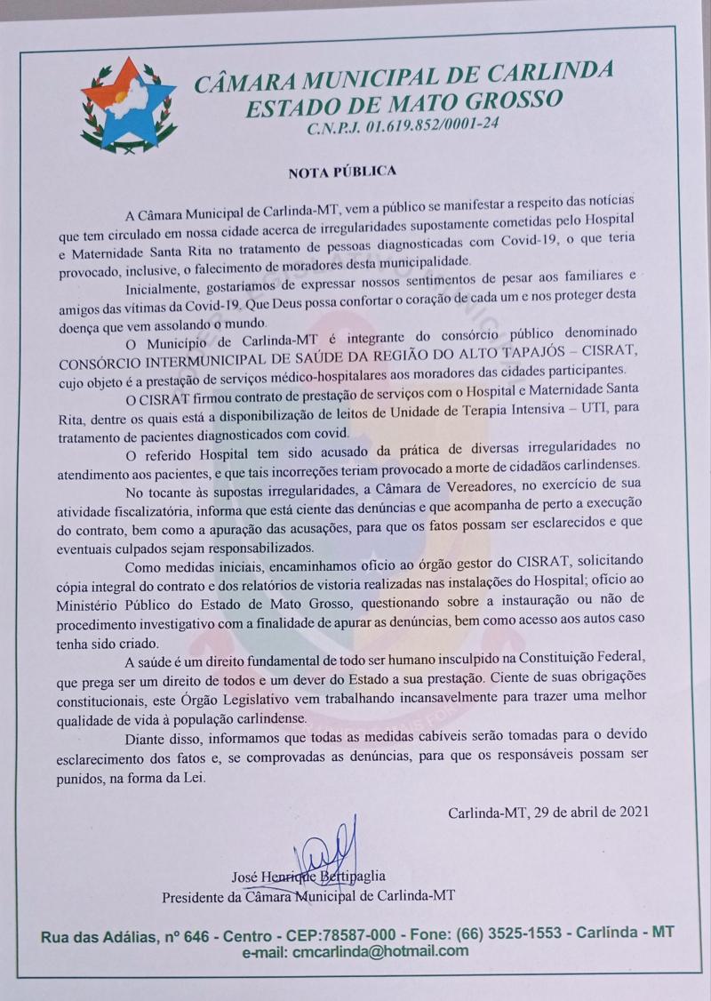A Câmara Municipal de Carlinda-MT se pronunciou oficialmente por meio de Nota Pública, a respeito das notícias que tem circulado sobre irregularidades cometidas pelo Hospital e Maternidade Santa Rita, no tratamento de pessoas diagnosticadas com a Covid-19, que segundo relatos teria provocado, inclusive, o falecimento de moradores desta municipalidade.